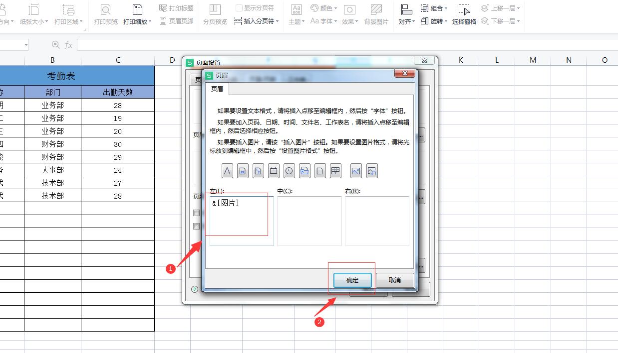 3、在弹出的【页眉】对话框中,插入图片的位置可以分为左、中,右三个位置。我们位置选择:左,就是把公司logo标志放到Excel表格的左上方,接着点击插入图片的图标,选择公司Logo标志插入,如下图所示