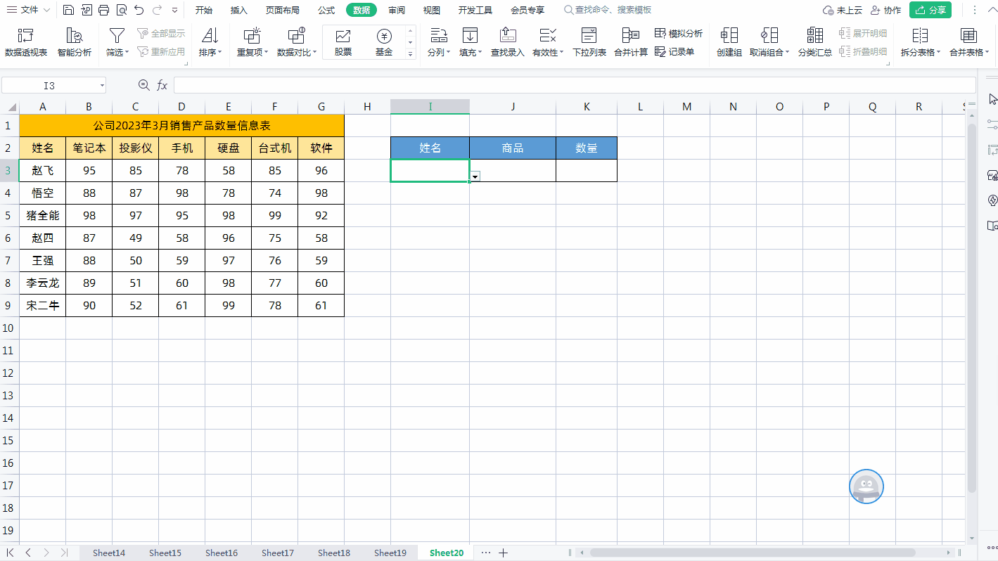 首先打开表格,我们以制作姓名下拉菜单为例,选中右侧查询表格“姓名”下方的空单元格,然后点击【数据】-再点击【有效性】,如下图所示
