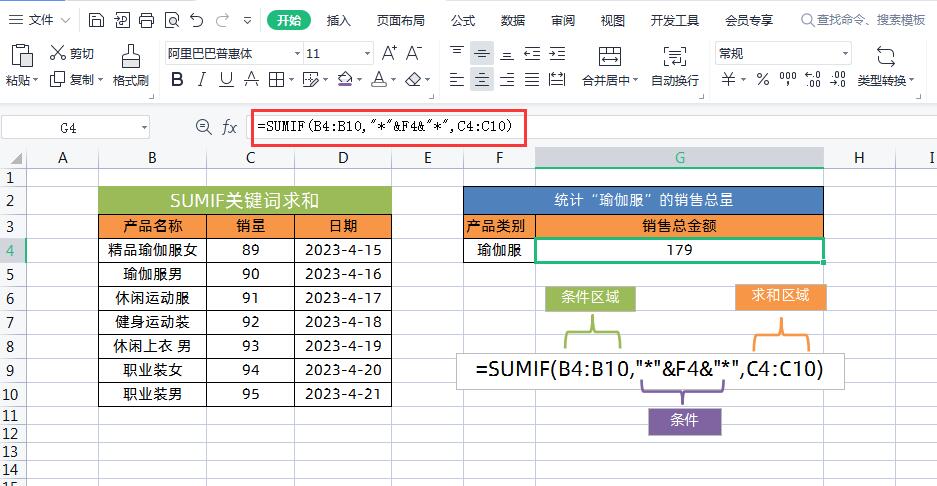 如下图所示,产品销售明细表,我们需要统计“瑜伽服”的销售总量,也就是要求商品名称包含“瑜伽服”就这三个字的产品总销量。这时我们就要借助一个通配符(*)星号,它的作用是表示任意多个字符。