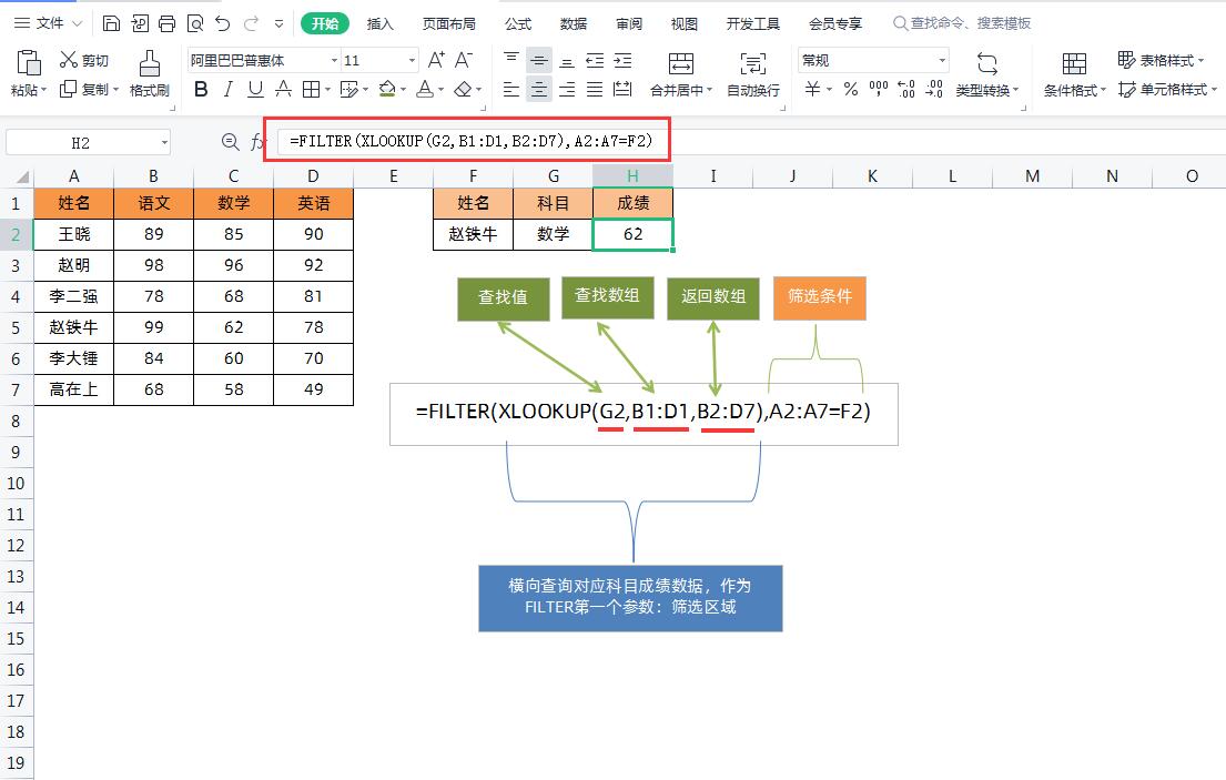 2、然后将XLOOKUP公式返回的指定科目成绩数据,作为FILTER函数的第1参数,从中筛选出A2:A7=F2就是具体姓名对应的成绩数据。