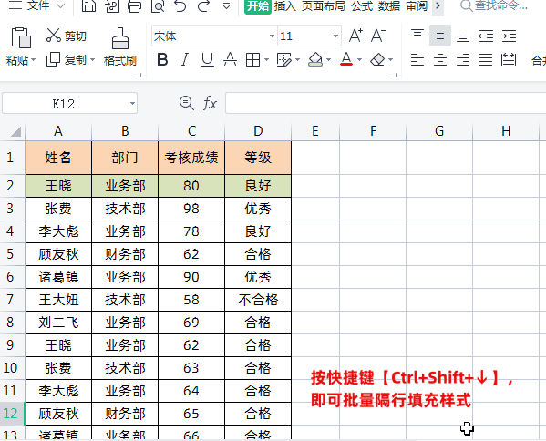 2、最后按快捷键【Ctrl+Shift+↓】,即可批量隔行填充样式,如下图所示