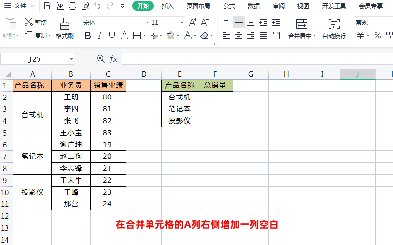 我们就以下面的表格为例,左侧是是产品销售业绩表,然后根据产品名称求和获取总销量,产品名称是合并单元格。