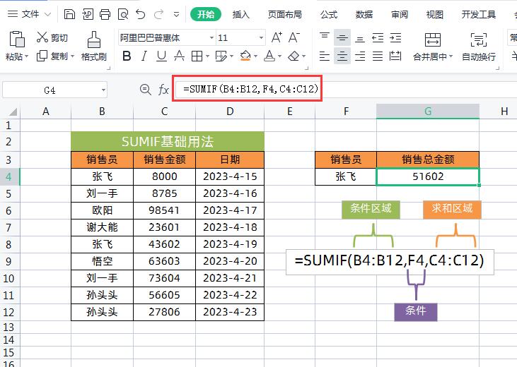 2、“不等于”条件用法,如下图所示,统计除了“张飞”以外的人员销售总金额。