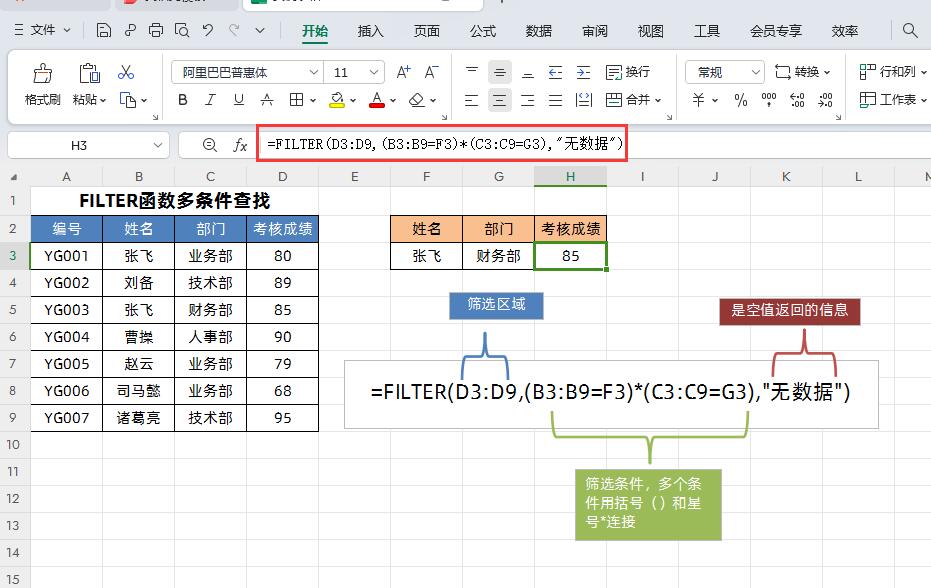①公式中第二参数:多条件筛选使用的是(B3:B9=F3)*(C3:C9=G3),有几个条件就用括号()和星号*连接,星号*的意思就是AND且的意义,会筛选出同时满足这几个条件的查询结果。如果查询的空值就返回第三参数:"无数据"。