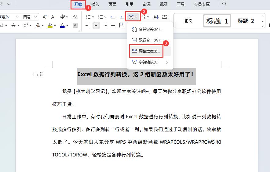 首先选中要调整间距大小的文字内容→然后在【开始】状态栏下,点击【中文版式】下拉菜单的【调整宽度】选项→在弹出的“调整宽度”对话框中调整【新文字宽度】中的字符数即可。