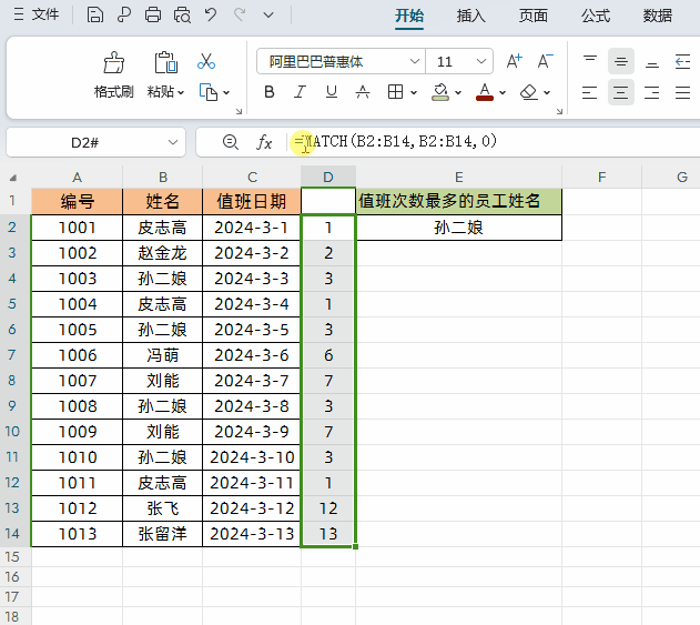 ①MATCH(B2:B14,B2:B14,0)公式中,查询值和查找范围都是B2:B14,也就是员工姓名,然后是精准匹配。这样返回的数据就是每个员工首次出现的位置。