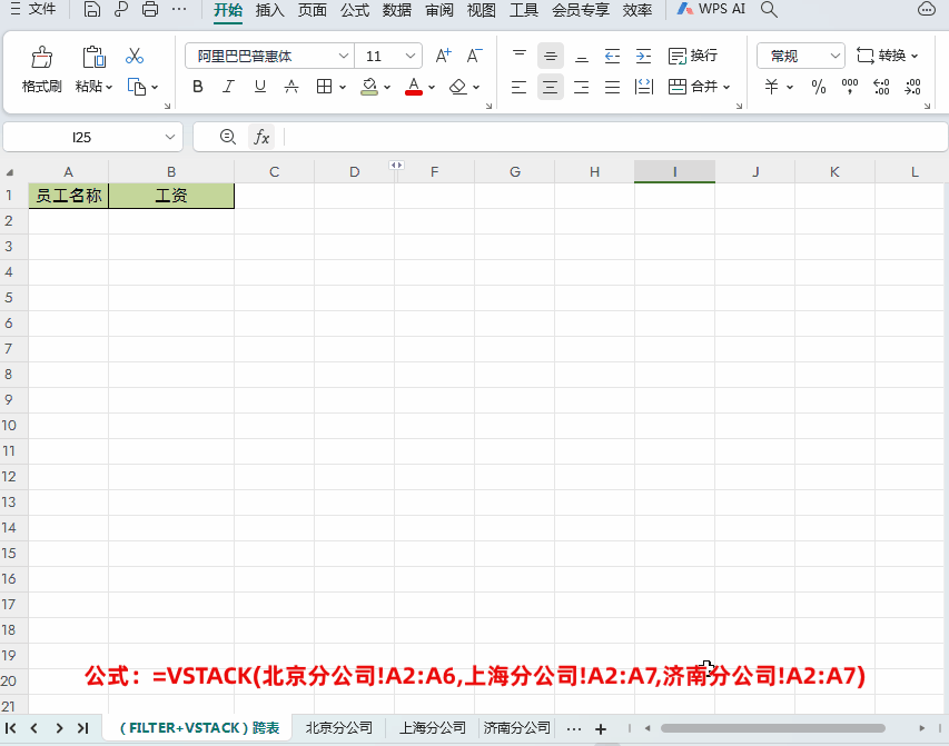 =VSTACK(北京分公司!A2:A6,上海分公司!A2:A7,济南分公司!A2:A7)