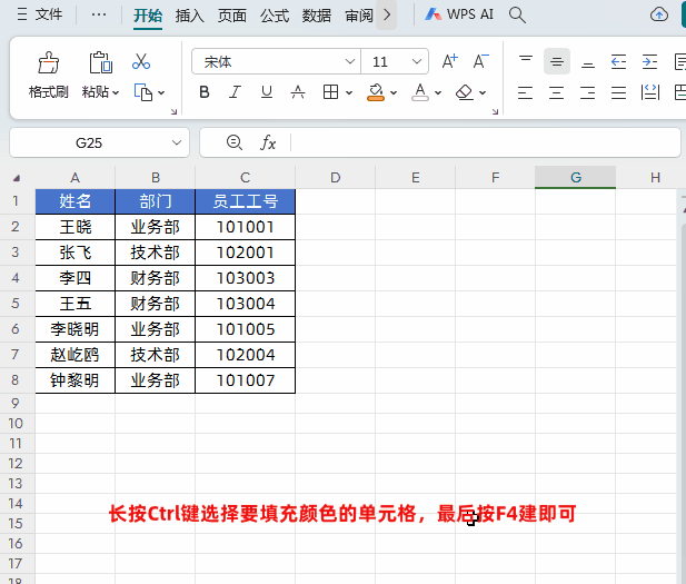 如果是需要对不连续的单元格填充样式,同样先为其中一个单元格填充颜色→然后长按Ctrl键选择要填充颜色的单元格,最后按F4建即可