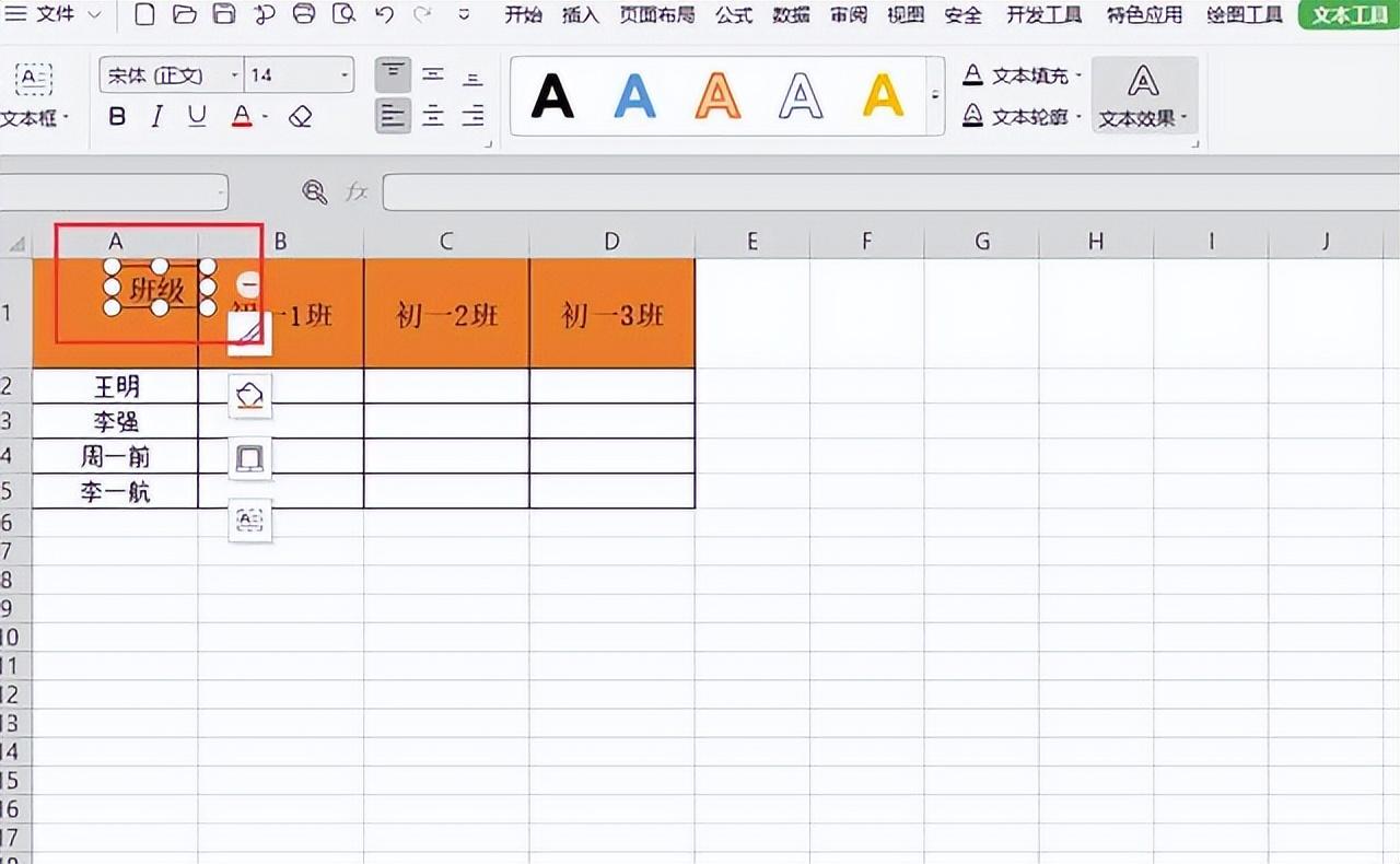 2、在文本框中输入“班级”二字,然后设置字体大小,再设置文本框到合适大小,如下图